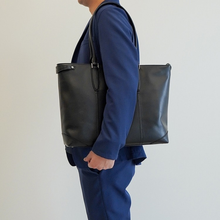 しっかりと自立する設計で、ビジネスバッグとしての機能性を高めています。