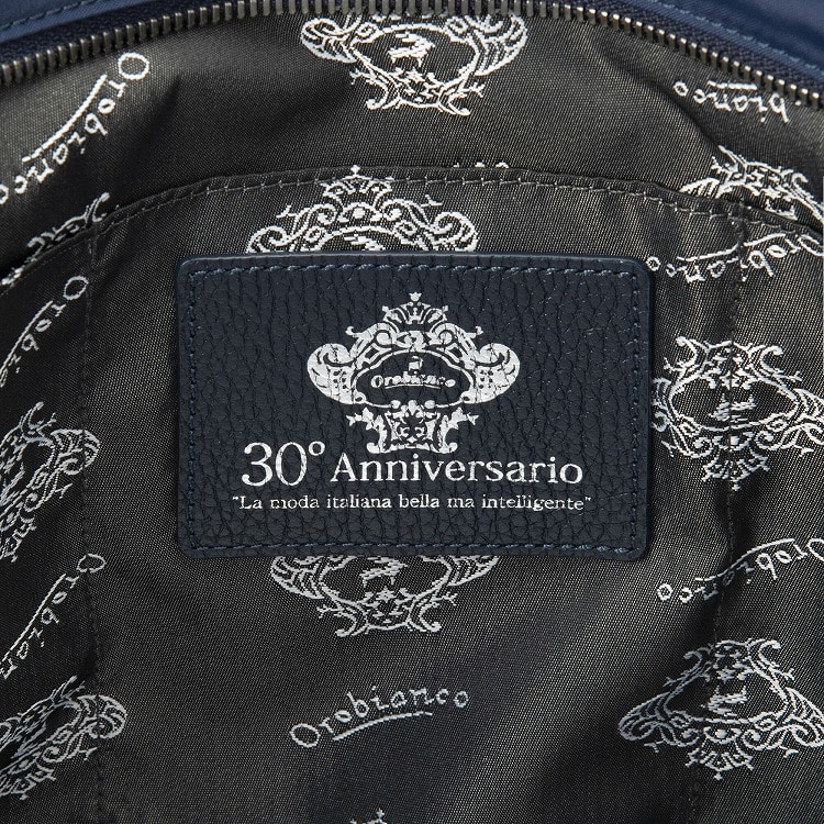 オロビアンコ30周年を記念した、ベーシックシリーズ。内装へはレザーに箔押しで表現した30周年限定グラフィックをデザイン。