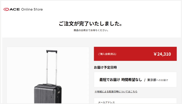 注文が完了しますと、『AE』から始まりますオーダーID記載のご注文完了画面が表示されます。またご注文時にご登録のメールアドレスへも、同様のオーダーIDを記載した自動メールが配信されます。