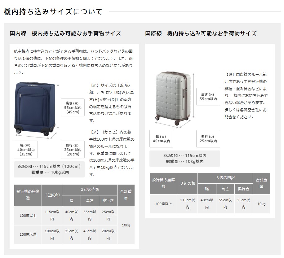 ※機内持込みサイズの規定に関しては航空会社などにより異なる場合がございます。